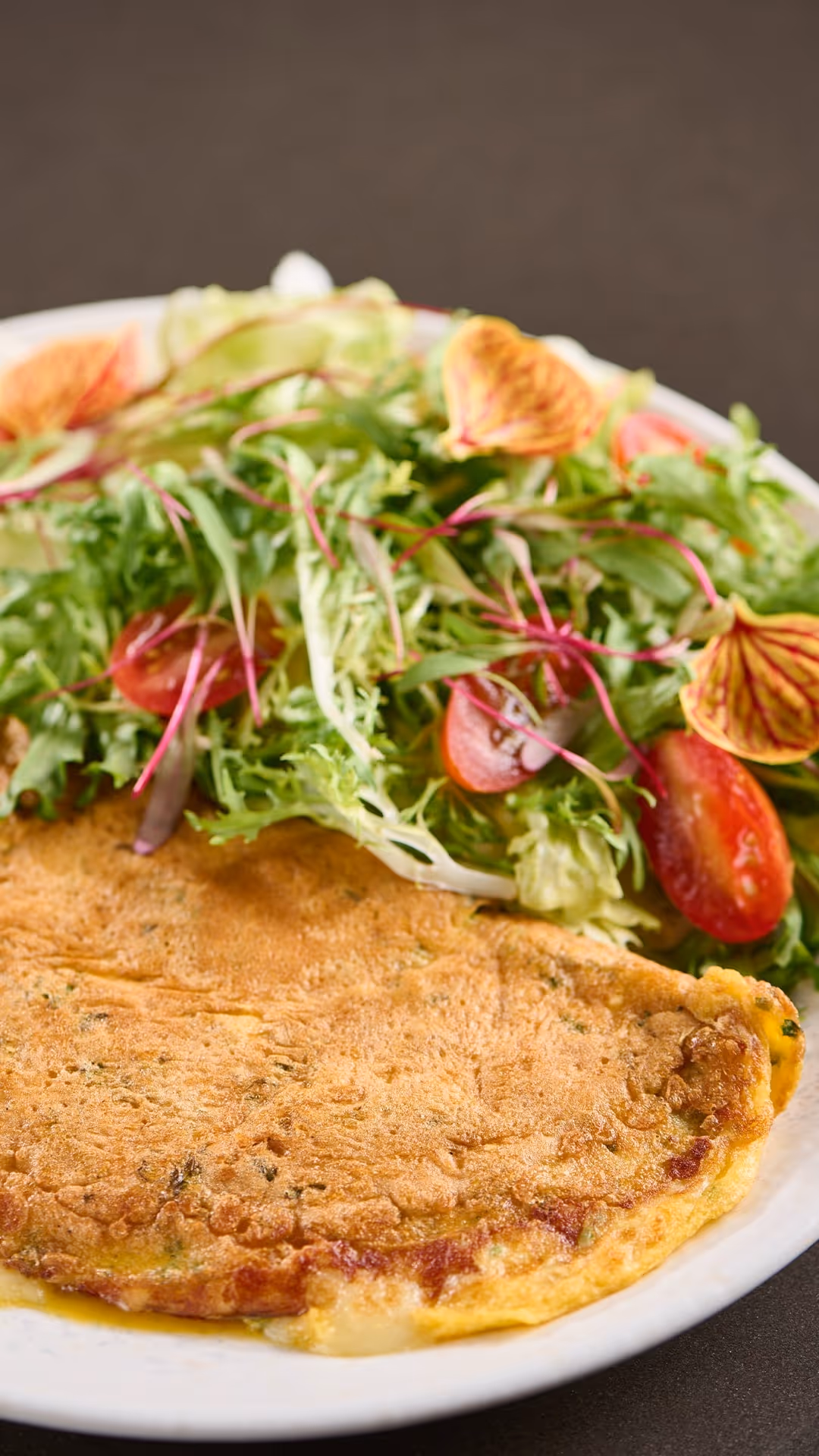 São 3 ovos com cebola, muçarela, parmesão, cheiro verde e salada de folhas verdes.